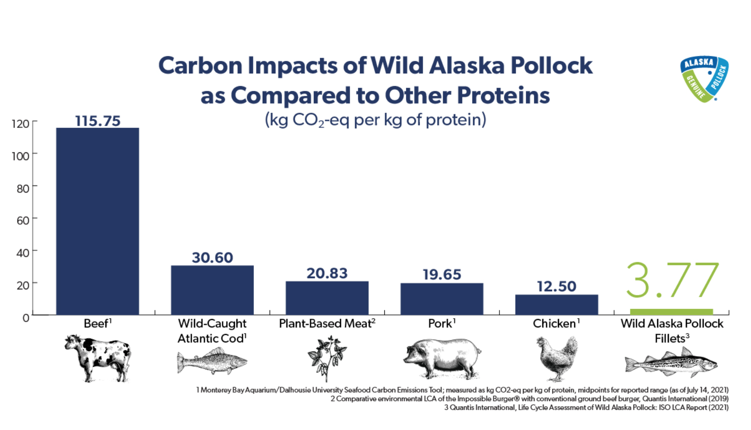 - Wild Alaska Pollock has a lower carbon footprint and delivers more protein per KG of greenhouse gas emissions than many other animal proteins, including beef, chicken, and plant-based options.